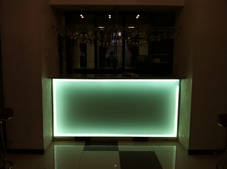 Эффект свечения барной стойки достигается путем размещения источников светодиодного освещения по периметру пространства за стеклом.